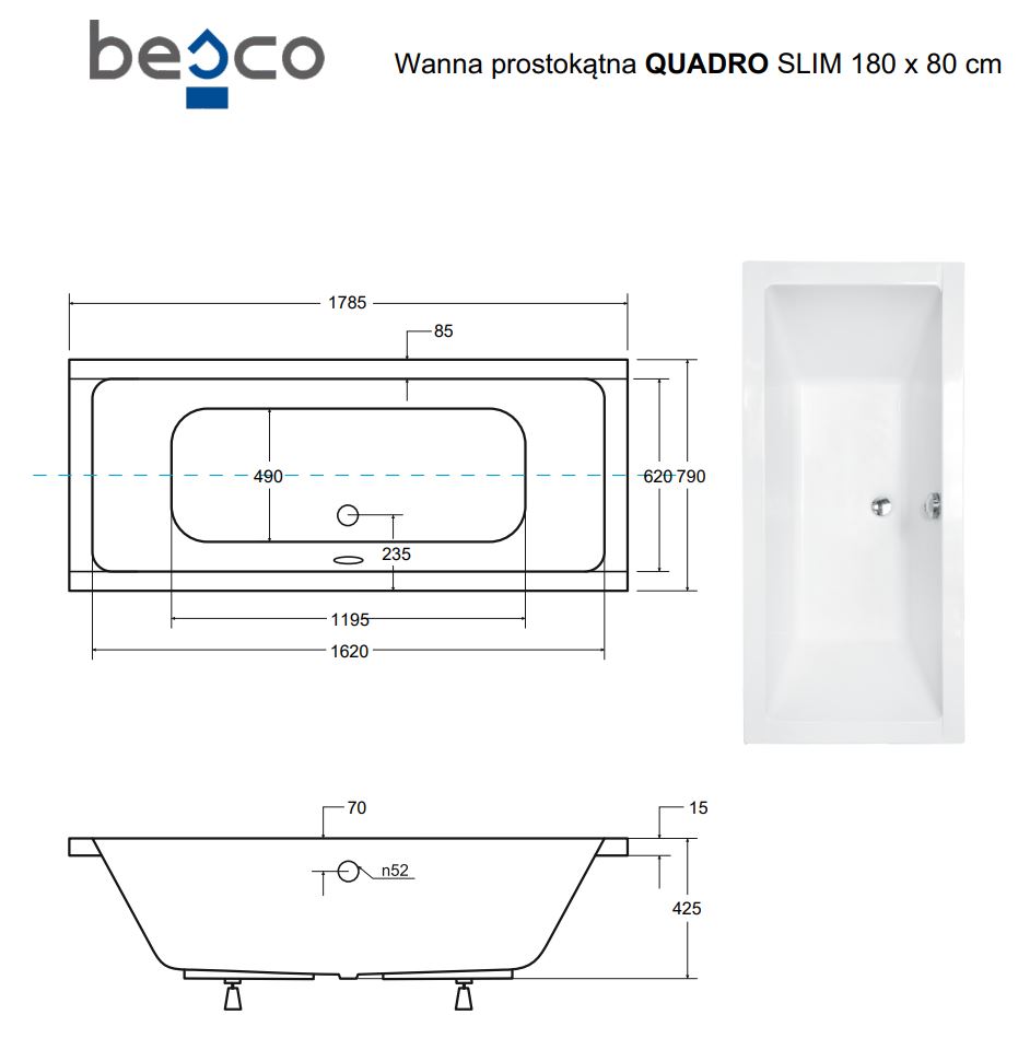 Besco QUADRO SLIM 180x80 cm egyenes kád, fehér WAQ-180-SL