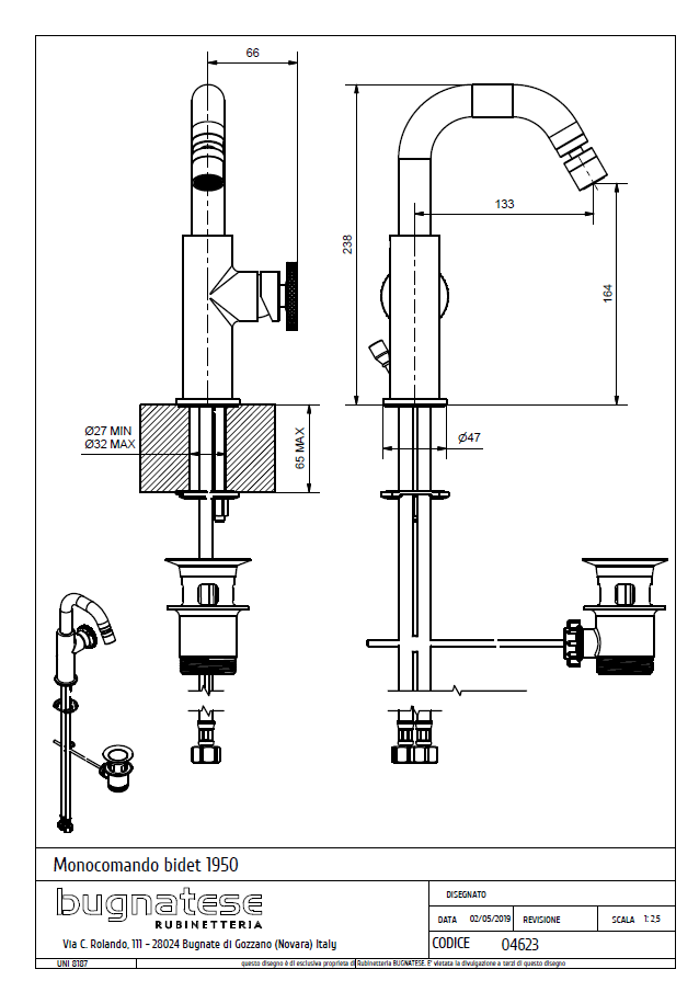 Bugnatese MILLENOVECINQUANTA Bidet csaptelep leeresztővel, króm 4623CRBugnatese