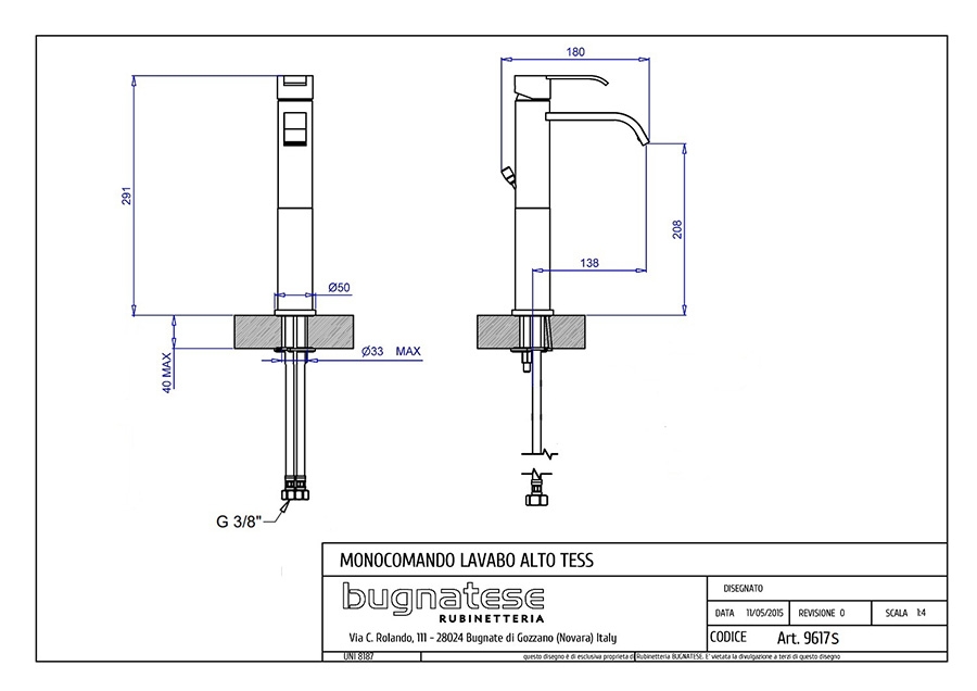 Bugnatese Tess magasított mosdócsaptelep klikk-klakk leeresztővel, szálcsiszolt nikkel 9617SCNSBugnatese