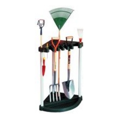 CORNER TOLL RACK funkcionális sarok állvány kerti szerszámok tárolására. Lapát, gereblye és egyéb tartozék rögzítésére alkalmas nyílással rendelkezik. Könnyű összeszerelni - a maximális stabilitás érdekében a garázs falára, tárolóra vagy szerszámos házra rögzíthető. A termék magas minőségű műanyagból készült, ellenáll a mechanikus sérüléseknek és az időjárás viszontagságainak.