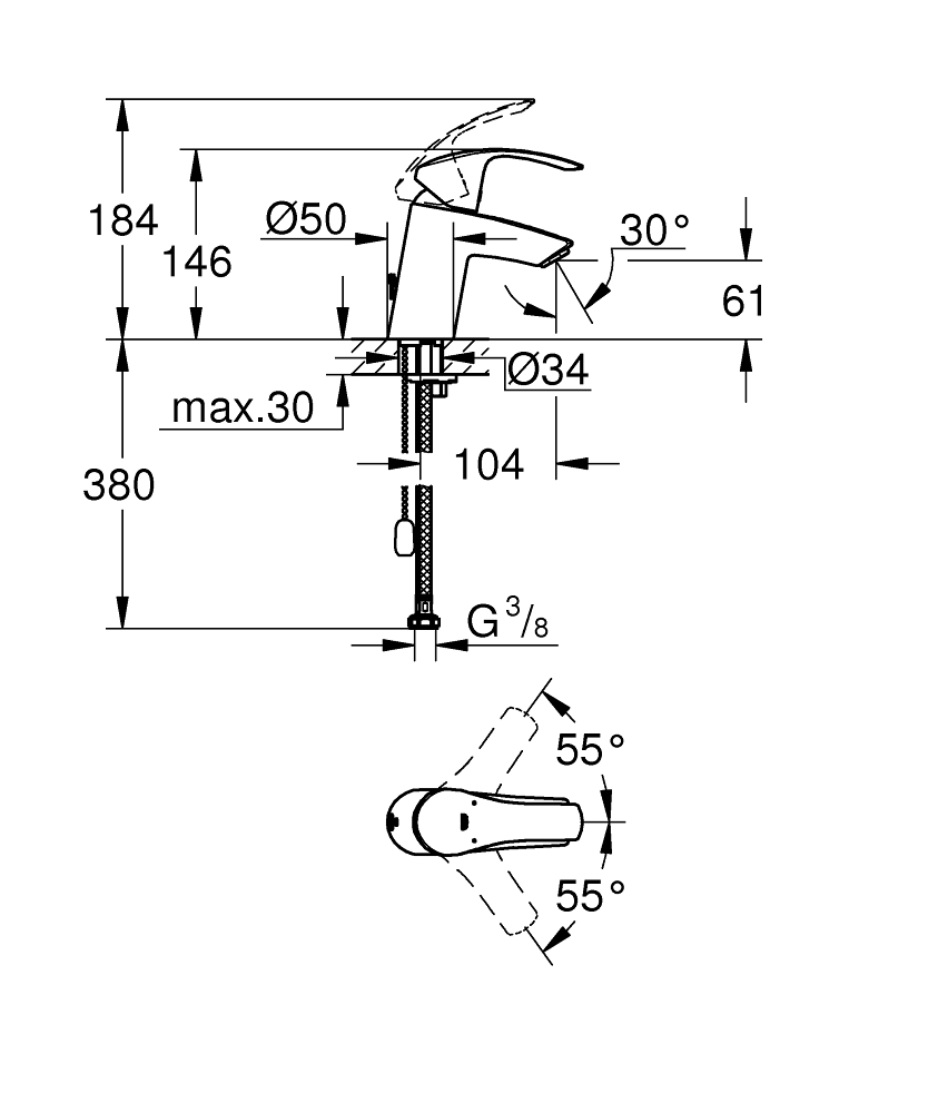 Grohe Eurosmart egykaros mosdócsaptelep behúzható lánc, S méret 33188002Grohe