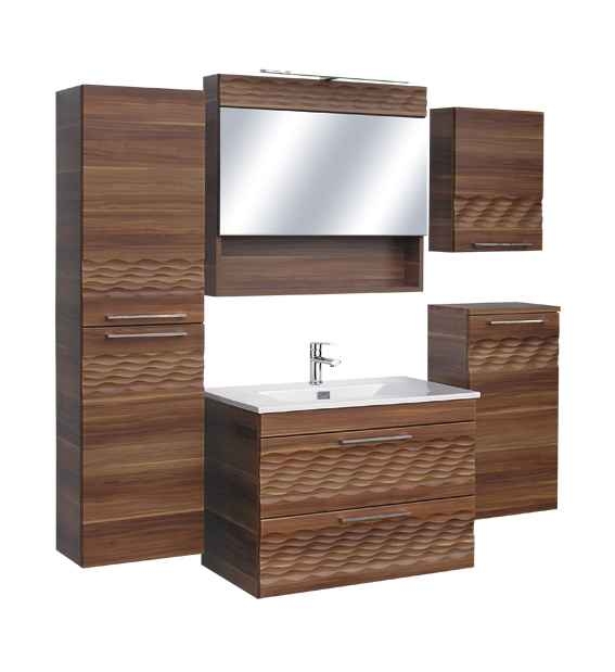 Guido Prémium Antonio fürdőszoba szekrény és kiegészítő bútorai 01. Felső tükör, led világítással 02. Fürdőszoba szekrény mosdóval 03. Hosszú fali szekrény 04. Kicsi fali felső szekrény 05. Kicsi fali alsó szekrény Megadott méretek: szélesség x magasság x mélység Kiváló tartósság Energiatakarékos led világítás Fékezőmechanikás fiókok MDF front marásmintával /marásminta nélkül is rendelhető Kosaras polc