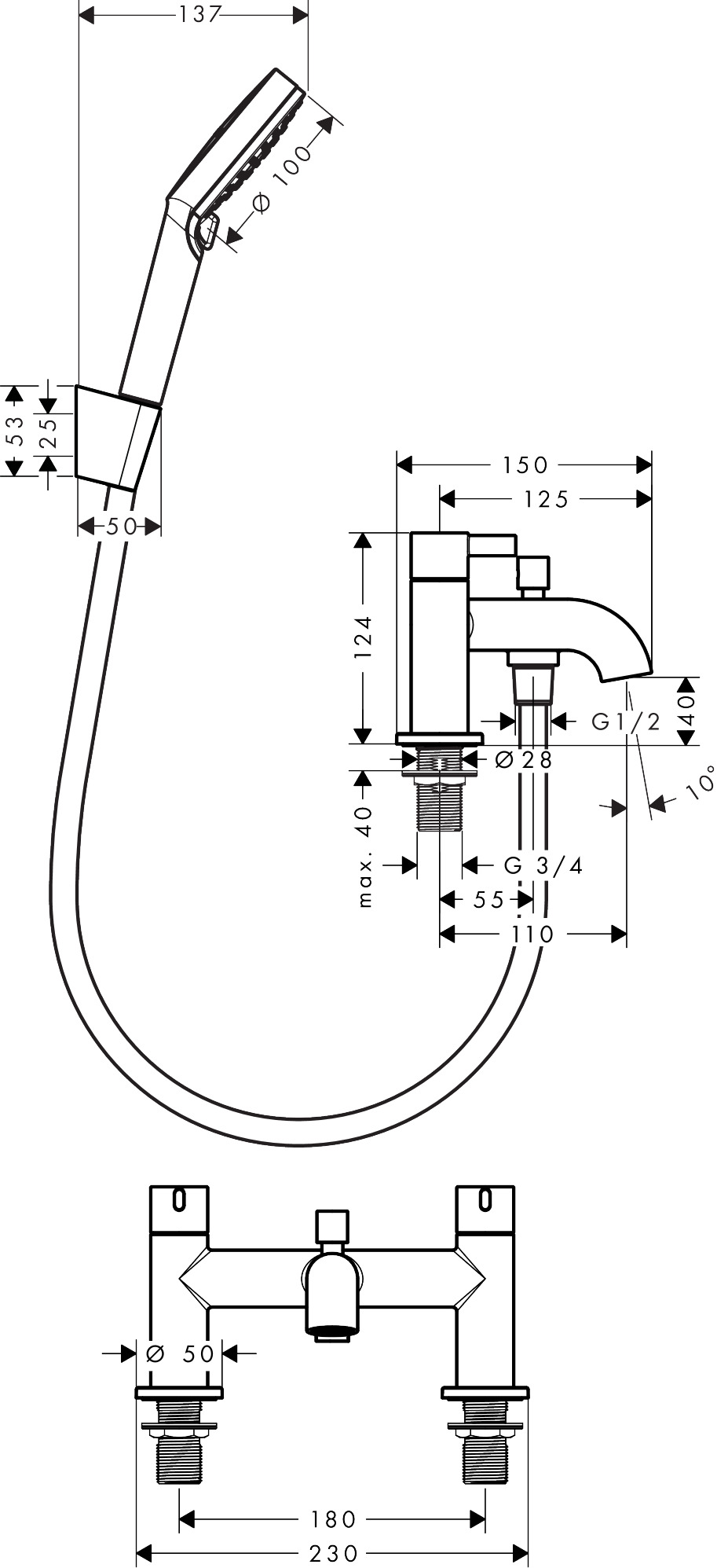 tartalmazza a következőket: 2-lyukú kádperemre szerelhető csaptelep, kézizuhany, zuhanytartó, zuhanytömlő