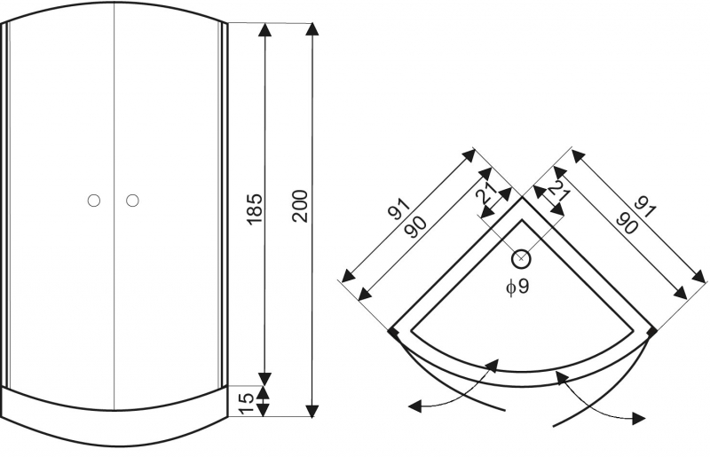 91 x 91 x 185 cm (Zuhanytálca nélkül)