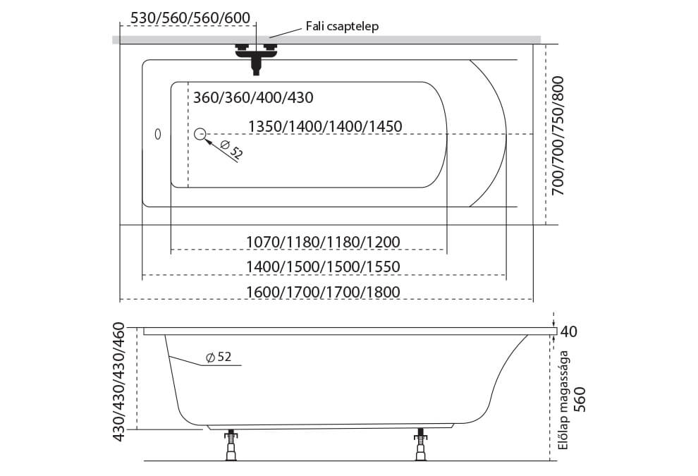 Opcióként rendelhető: le- és túlfolyó, elő- és oldallap, Soft fejpárna, kádparaván