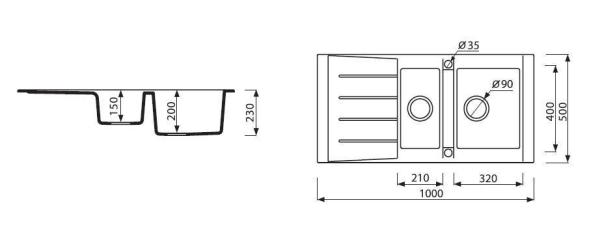 Anyaga: magranit Mérete: 1000x500x230 Első medence mérete: 210x400x150 Második medence mérete: 320x400x200 Min. beépítési méret: 70 cm Kivitel: megfordítható A képek és anyagszínek illusztrációk, a valós színektől eltérhetnek.