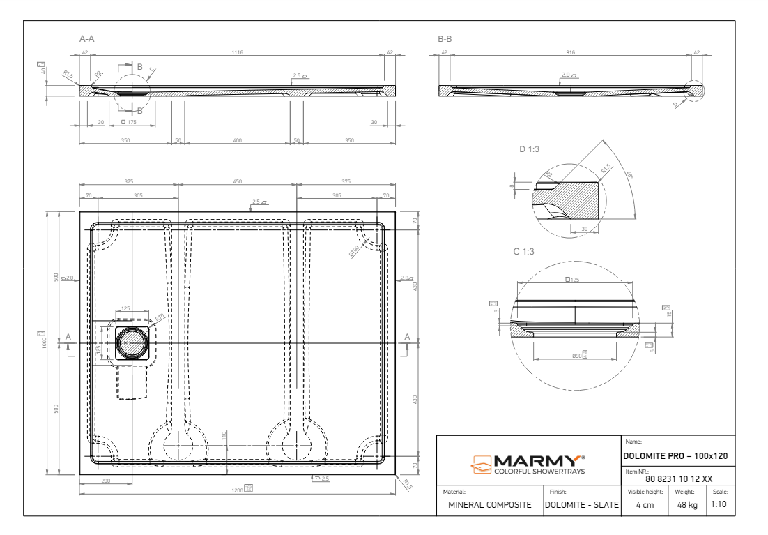 A MARMY DOLOMITE PRO zuhanytálcája - a DOLOMITE sorozat PEREMES változata - kombinálja az elegáns ROZSDAMENTES összefolyót, a professzionális GEBERIT szifonnal és a könnyen beépíthető alaptálcával. Extra vékony mindössze 4 cm, felülete matt kőhatású, csúszásgátlós, masszív és szuper strapabíró ÚJ GENERÁCIÓS öntött márvány zuhanytálca. A zuhanytálca háromféle módon is beépíthető, padlóra helyezve, félig süllyesztve, süllyesztve.