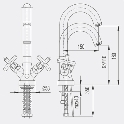 * csaptelep test anyaga: rézötvözet * bevonata: Króm * kerámiabetét: 2db kerámia csapbetét * üzemi víznyomás: 3 atm. * üzemi vízhőmérséklet: ≤90°C * átfolyási mennyiség: 20 l/min * nettó súly: 2,43 kg * Csatlakozás: hossza L= 350mm, M10x1/G3/8" menetes csatlakozás * Tartozékai: 2 darab M10x1/G3/8" felxicső, automata pálcás leeresztőszelep, * Garancia: 10 év alkatrészek garanciája 100 év garancia nem mozgó alkatrészekre
