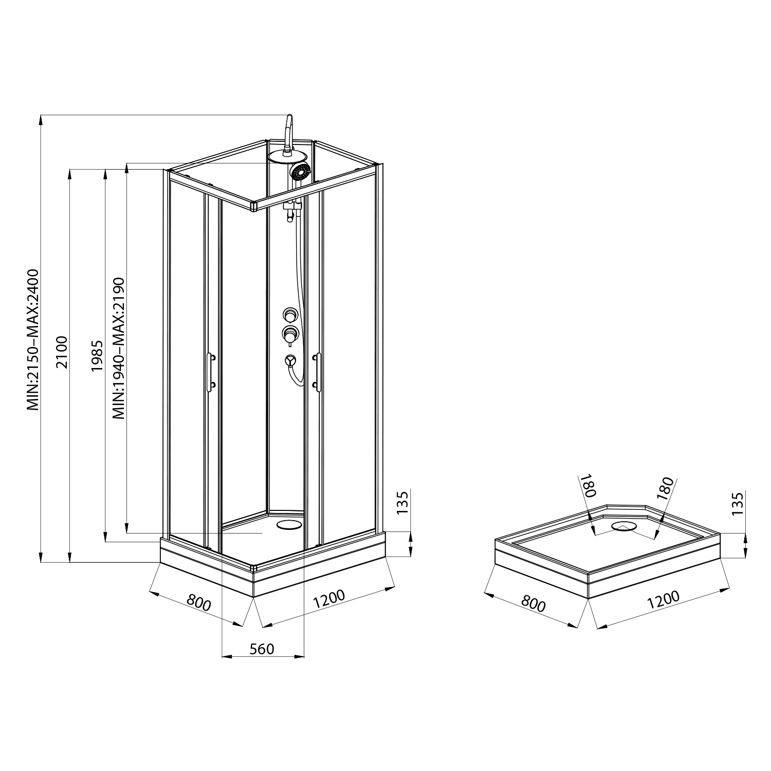 Sanimix üveghátfalas szögletes zuhanykabin tálcával 120x80x215cm 22.8708-120