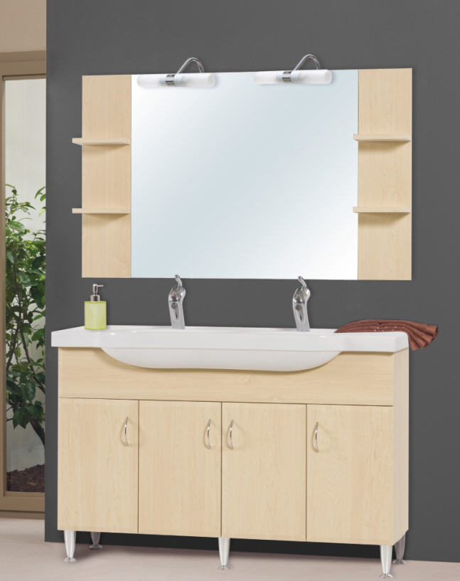 Tboss Evelin 130 fürdőszobabútor Alsó szekrény mosdóval + Tükrös felsőrész Magasfényű, fóliázott MDF Kerámia mosdó Beépített halogén világítás és kapcsoló Csaptelep nem tartozék Alapszínek: fóliázott MDF magasfényű fehér, erezett fehér, körte, juhar, bükk, cseresznye, calvados, szilva, dió, venge, tölgy Extra színek: Alapszínes ár +15% Színminta üzletünkben megtekinthető!