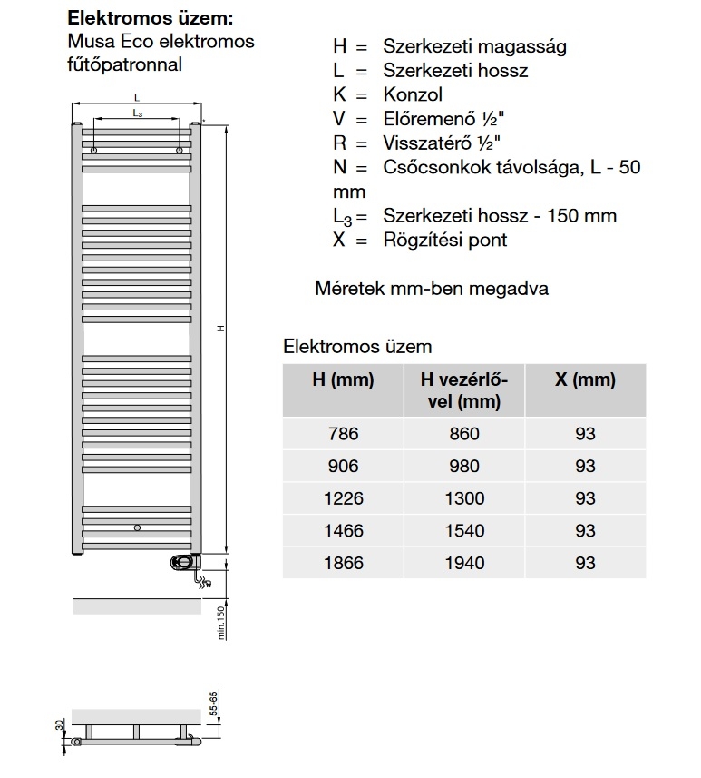 Beépített Musa Eco elektromos fűtőpatronnal. IP44 szintű védelemmel (fröccsenő